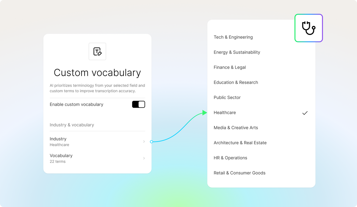 Auto-generation of transcripts and summaries using AI-selected languages, templates, and LLMs.