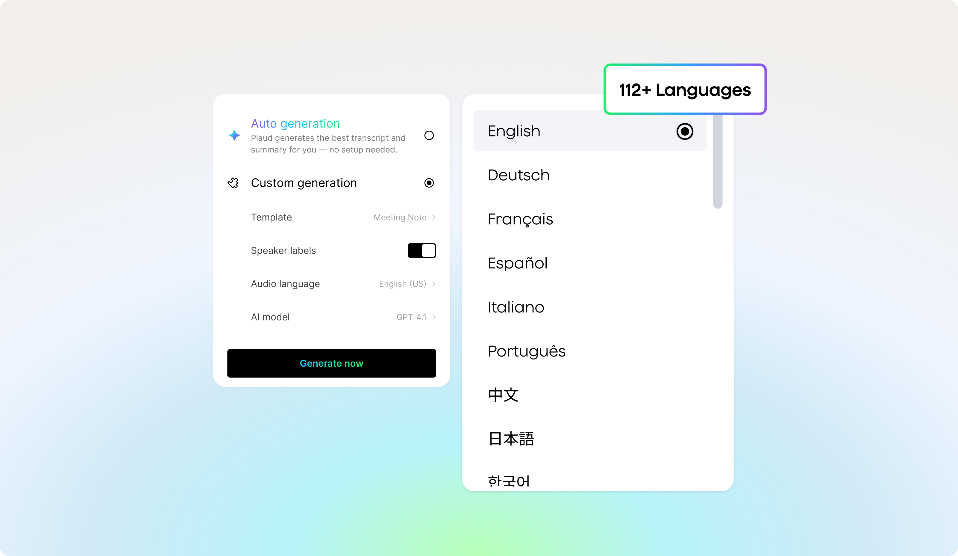 Automatische generatie van transcripties en samenvattingen met behulp van door AI geselecteerde talen, sjablonen en LLM's.