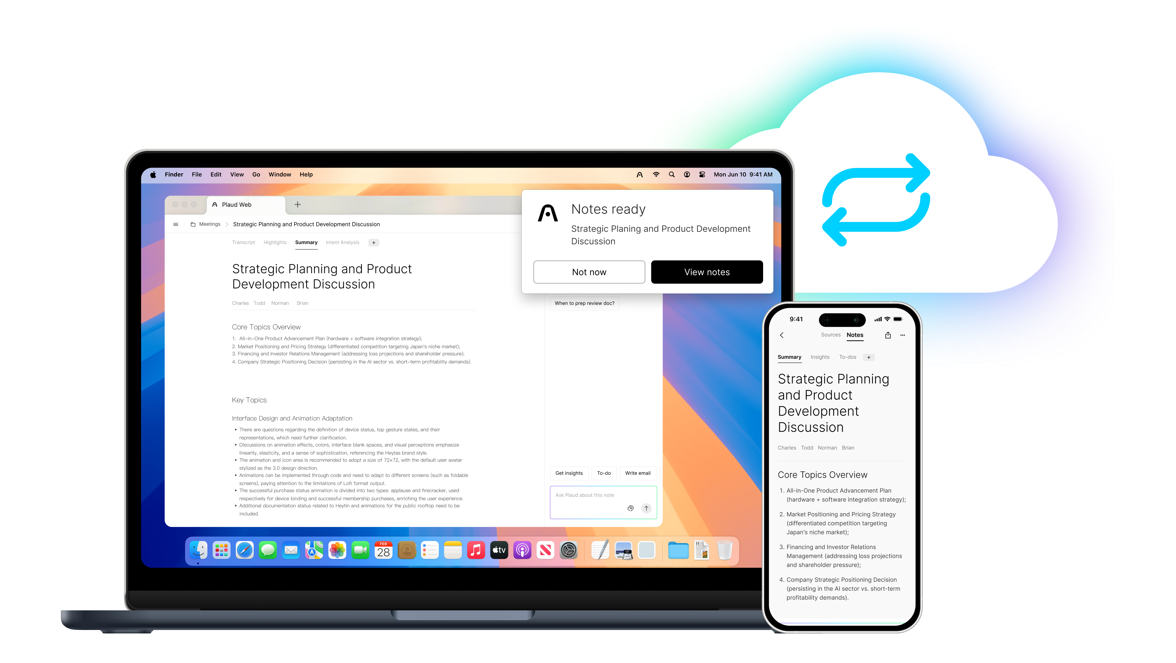 Maak notities met Plaud AI en krijg toegang tot uw opnames, transcripties en samenvattingen via de app, het web en uw desktop, met onbeperkte opslag in een beveiligde cloud.