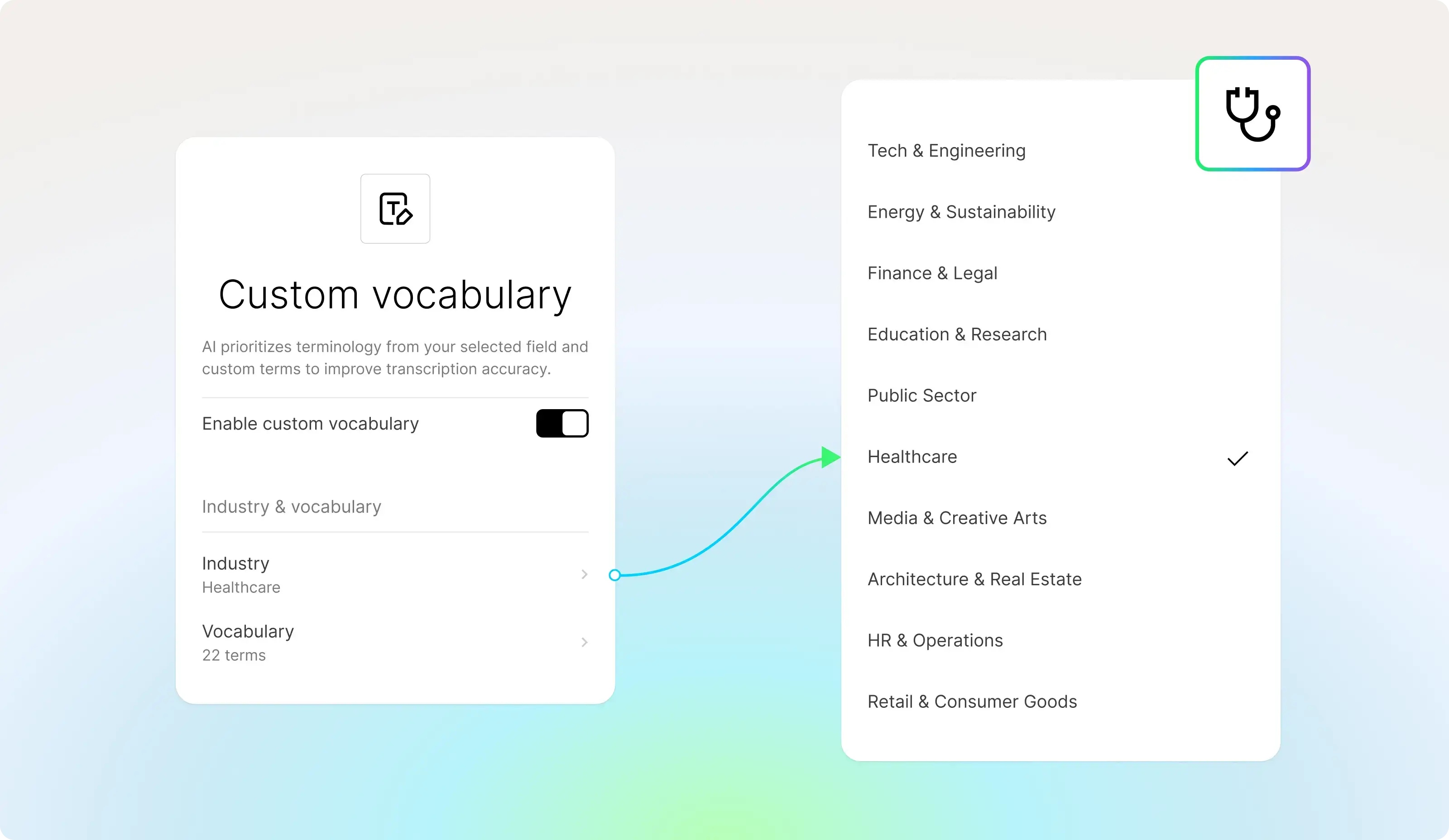 Auto-generation of transcripts and summaries using AI-selected languages, templates, and LLMs.