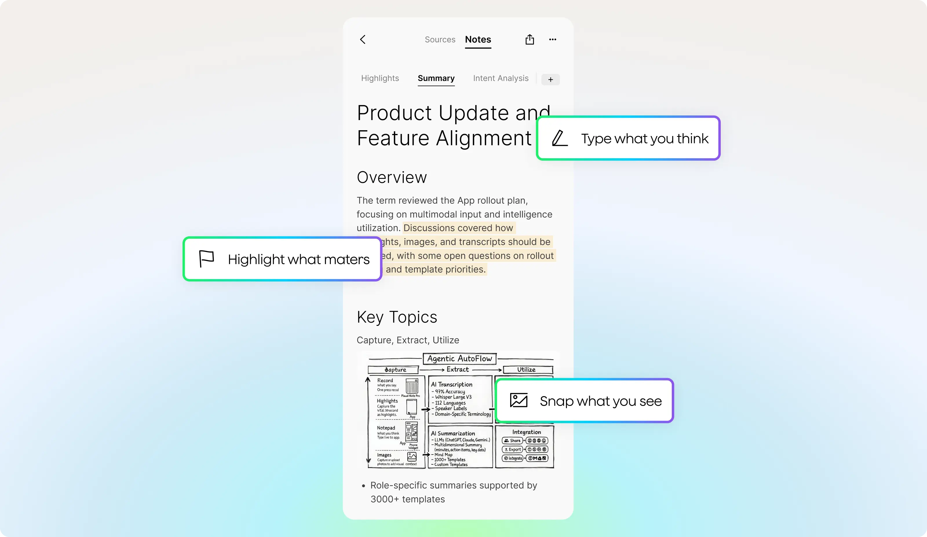 Multimodal input: Capture audio, notes, images, and highlights for richer context.