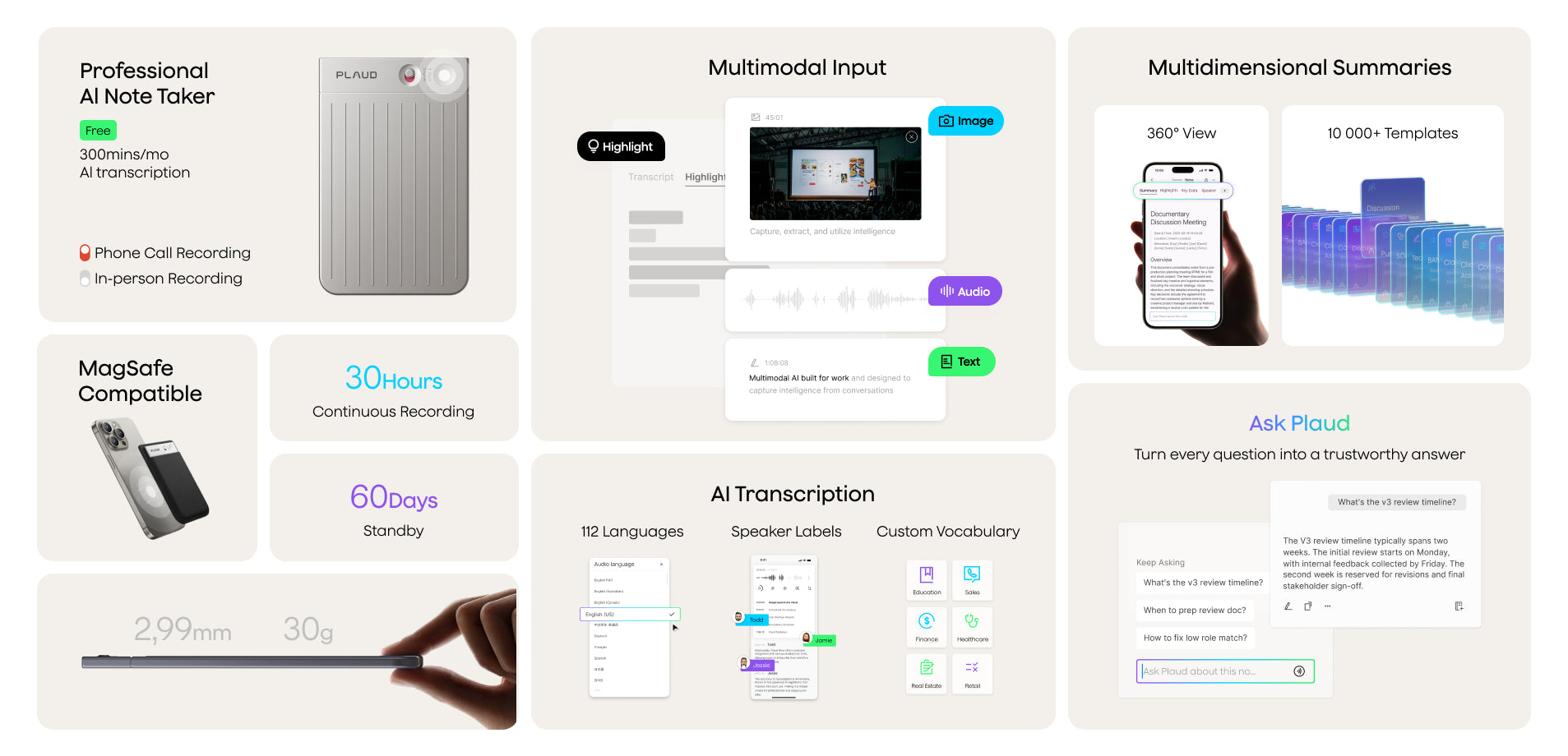- Plaud Intelligence : transcrição por IA em 112 línguas com identificação dos falantes e vocabulário personalizado. Gere resumos multidimensionais com mais de 10.000 modelos, mapas mentais e uma integração perfeita com o fluxo de trabalho.