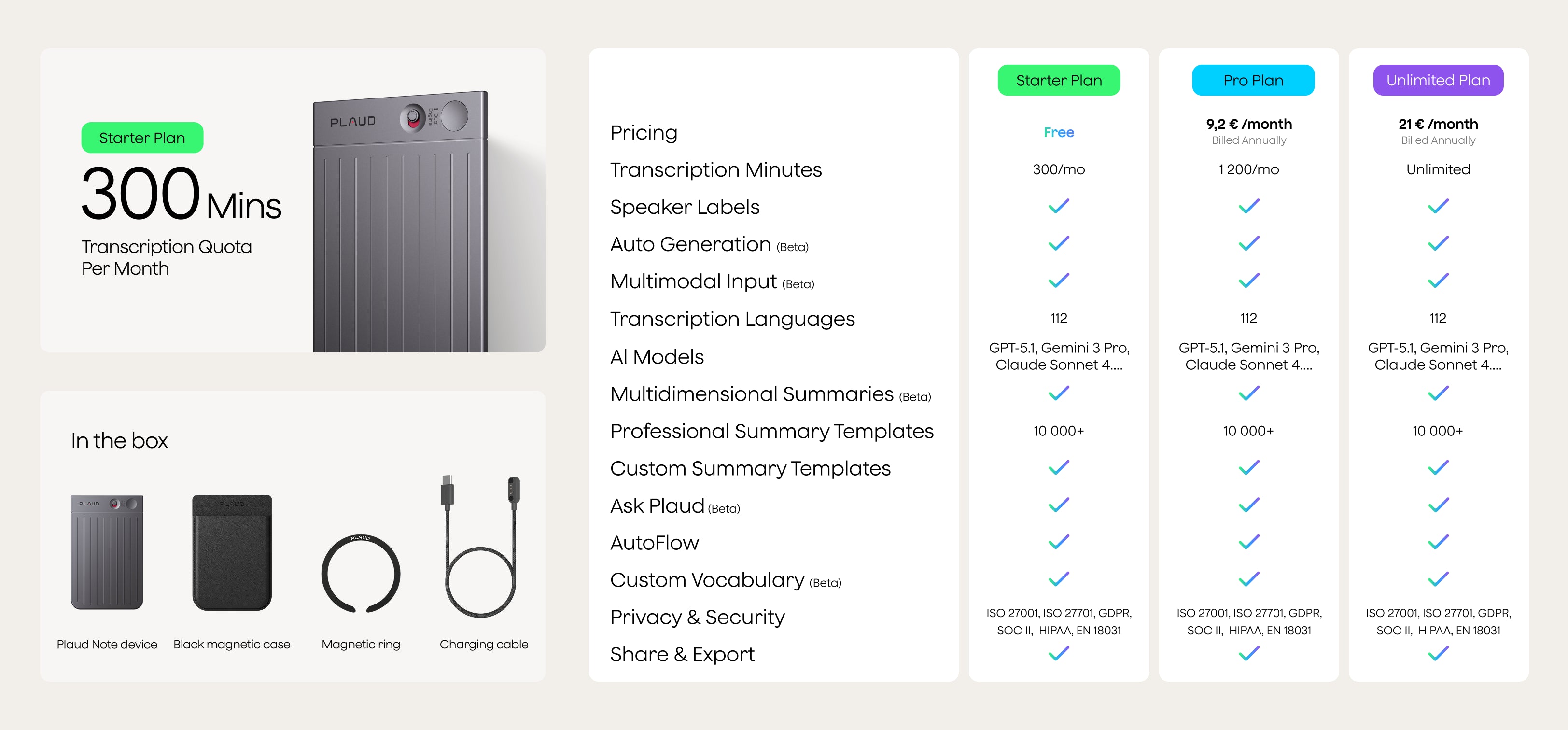 - Tudo incluído : Cada dispositivo de anotações Plaud AI vem com uma quota mensal de 300 minutos de transcrição, uma capa magnética, um anel magnético e um cabo de carregamento.